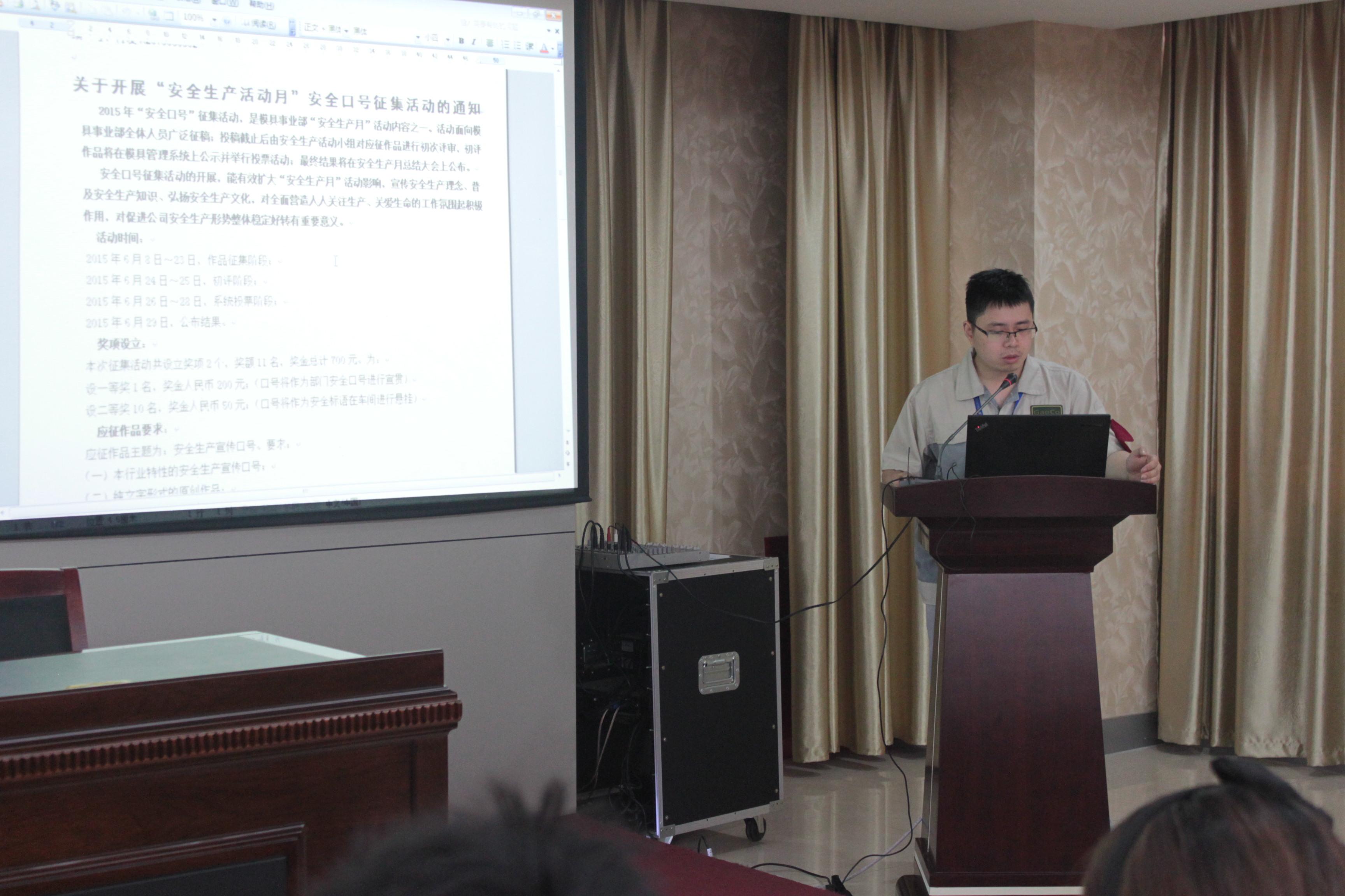 經過安全生產活動小組的精心布置,會場給以振奮之感。隨著部門人員陸續入場、簽到,誓師大會即將開始。